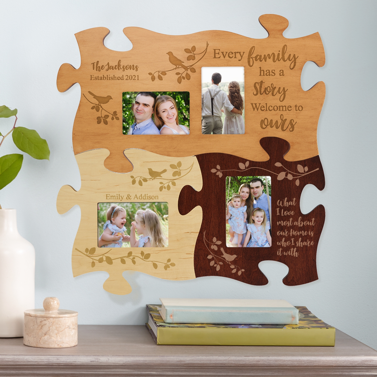 Shop for puzzle frames at bed bath & beyond. The roots of a family tree, puzzle piece photo frame. Regular price $17.99 save $0.00. Each piece is connectable and equipped with pocket mounts for easy wall hanging. Holds 2 4x6 photos & 1 5x7.
